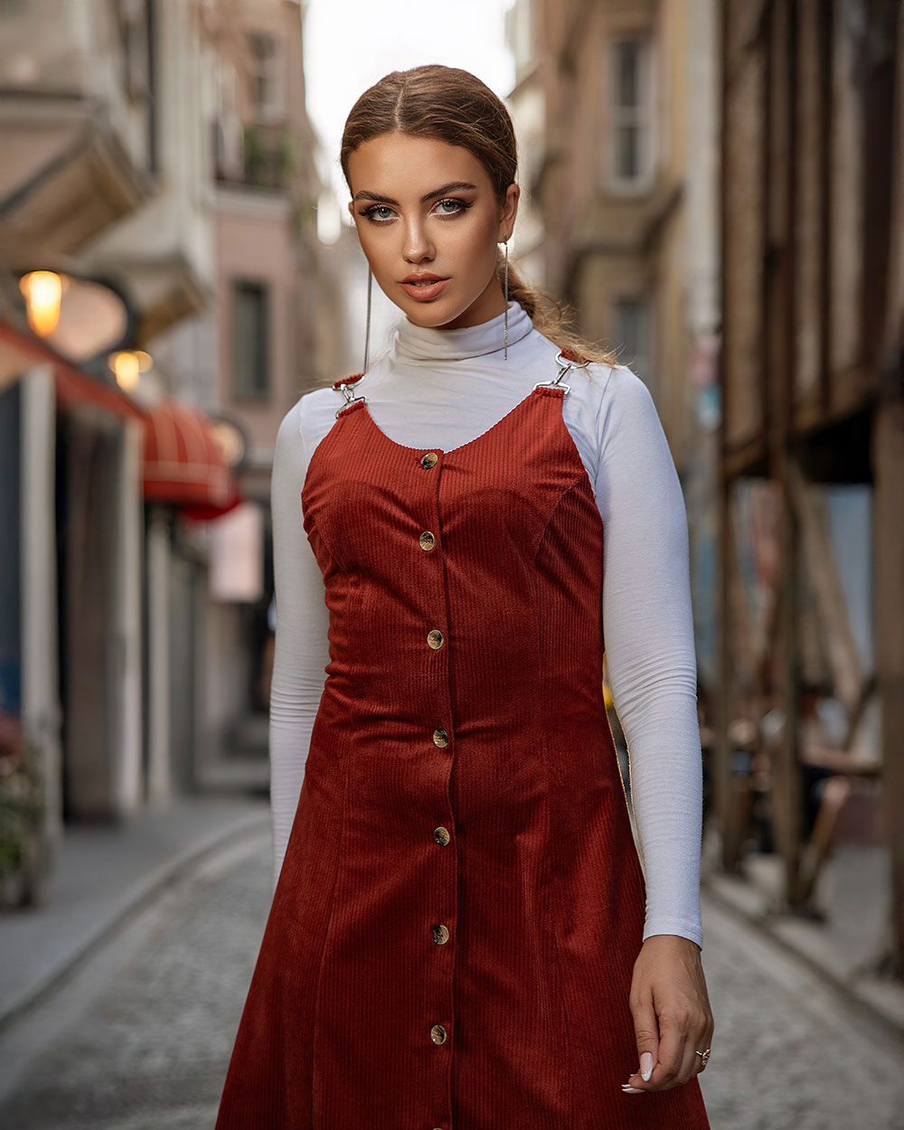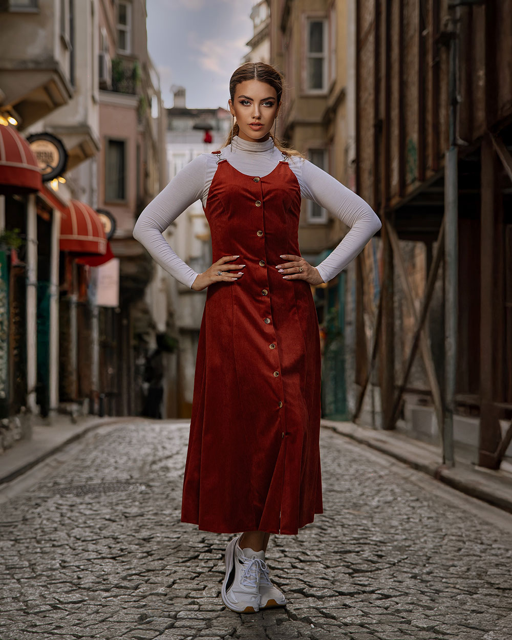 Turn heads in the Red Corduroy Dress, where bold color meets soft comfort and classic design. The flattering A-line silhouette and button detailing create a confident, feminine look. A perfect choice for casual days with standout flair.